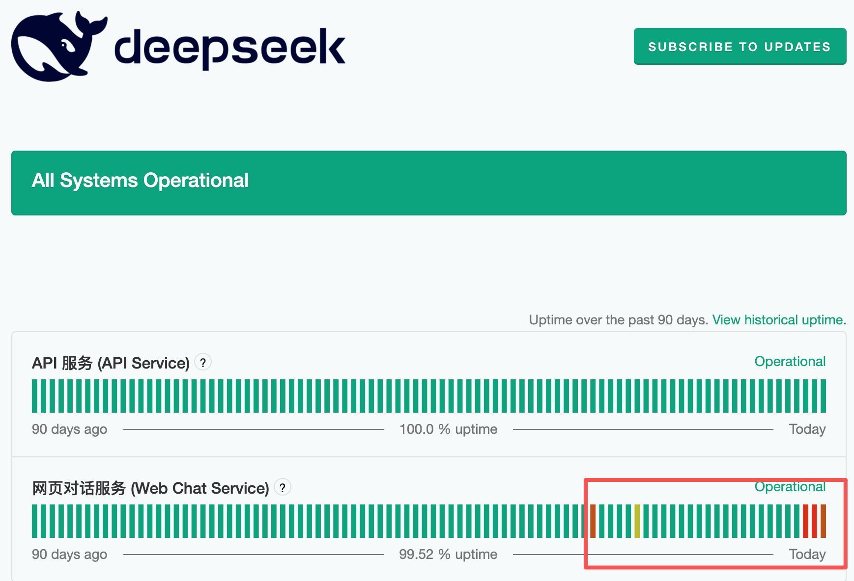 记者注意到,DeepSeek服务状态页面显示,其网页对话服务(WebChatService)层在过去90天,已出现5次故障。其中3月29—30日的故障时间最长。