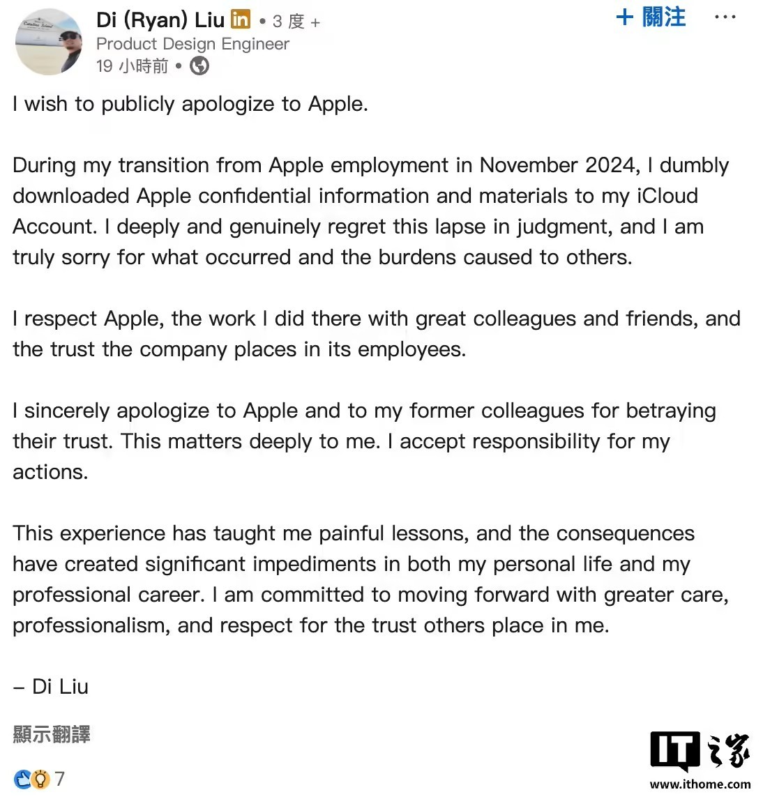 此外,Liu 还通过领英公开道歉,承认自己“错误地下载了苹果公司内部机密资料”,并将此行为称为“判断失误”,表示愿意承担全部责任。他还提到,此次事件已对其个人生活和职业发展造成“重大影响”。事实上,自 2025 年被起诉以来,他也未再在 Snap 任职。