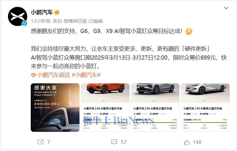 此外,本次发布会小鹏还为老车主带来了「自动驾驶小蓝灯」,众筹价格为 899 元,支持小鹏 X9 / G9 / G6 / P7i / P7。