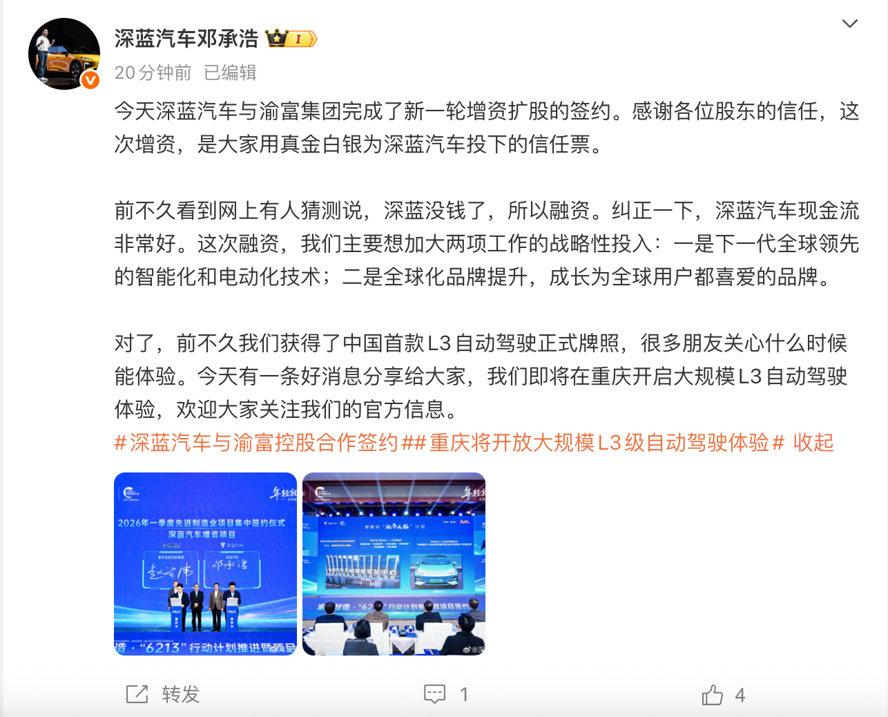 小鹏汽车董事长兼CEO何小鹏提出2026年公司两大关键词——“物理AI”与“全球化”,并宣布三大布局:第一季度实现第二代VLA量产上车、启动Robotaxi运营、推进人形机器人与飞行汽车规模量产。