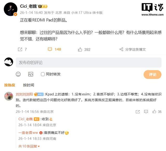 有网友提出了 REDMI K Pad 的遗憾,包括 1.没有 eSIM;2.音质不够好;3.边框不等宽;4.没有指纹识别,魏思琪回复:“收到。”这意味着后续迭代款有望在这四方面进行补足和加强。
